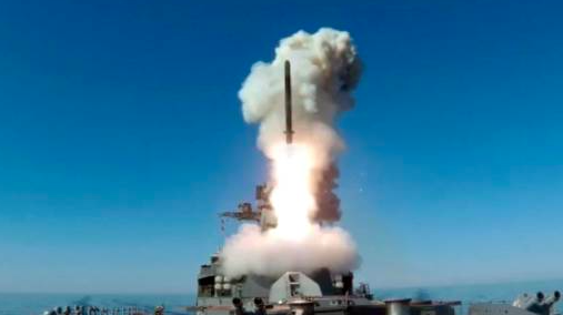 Tàu khu trục Marshal Shaposhnikov thuộc Hạm đội Thái Bình Dương của Nga bắn tên lửa Kalibr. Ảnh tư liệu.