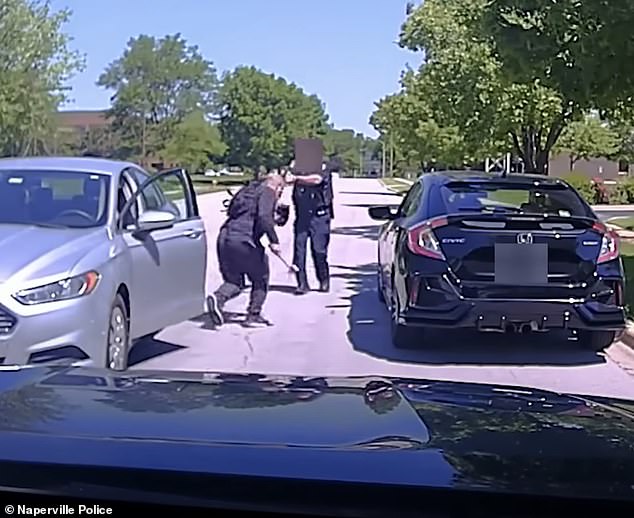 Một chiếc xe màu xám không liên quan chạy ngược chiều liền dừng lại ngay bên cạnh xe cảnh sát, theo Sở cảnh sát Naperville, ngoại ô thành phố Chicago.