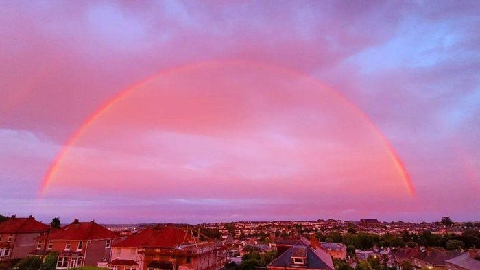 Cầu vồng bất thường xuất hiện ở Anh. Hôm 18/6, người dân trên khắp nước Anh vội vã ghi lại những khoảnh khắc lạ thường của bầu trời khi hoàng hôn chuyển màu hồng, đỏ và cam.