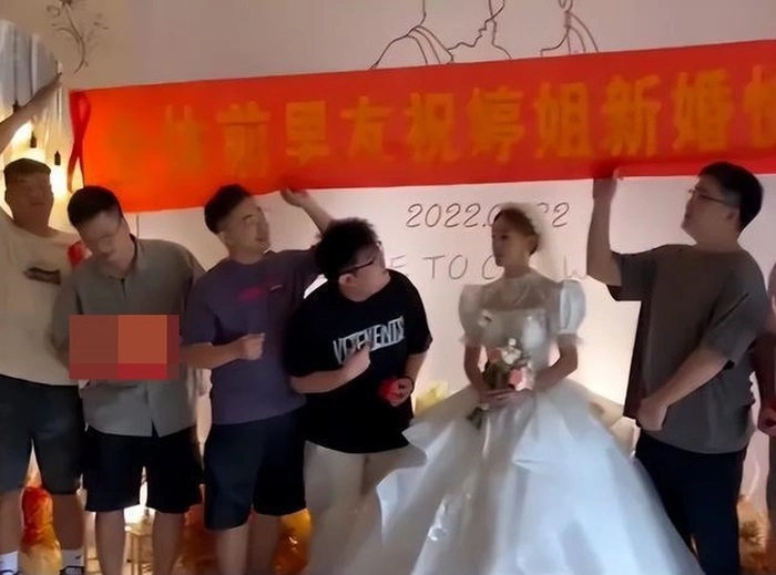 Theo như điều đáng chú ý từ 9 bạn trai cũ của cô dâu đem theo một băng rôn với dòng chữ: "Tập thể bạn trai cũ chúc mừng Ting có một đám cưới hạnh phúc", khiến cô dâu và 9 anh chàng này đều tươi cười nói vui vẻ với nhau trong đám cưới gây xôn xao mạng xã hội.