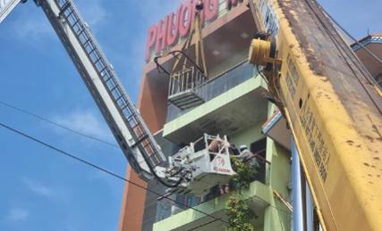 Phía sau ngôi nhà bốc cháy to, phía trước có người mắc kẹt nên cơ quan chức năng đã điều nhiều xe chuyên dụng vừa làm công tác chữa cháy, vừa làm công tác cứu hộ; đồng thời huy động thêm một xe thang nâng bên ngoài để đưa người lên trên tầng 4 cứu người gặp nạn.