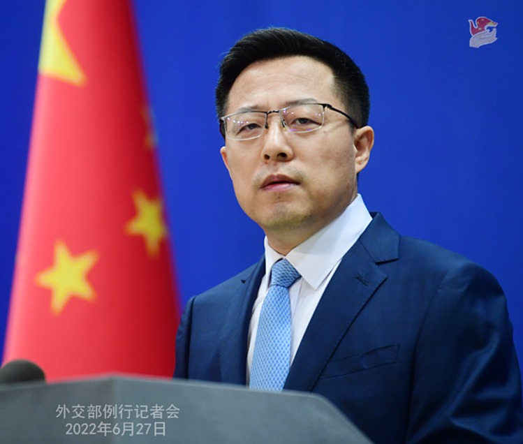 Người phát ngôn Bộ Ngoại giao Trung Quốc Triệu Lập Kiên tại cuộc họp báo ở Bắc Kinh ngày 27/6. Ảnh: BNG Trung Quốc.