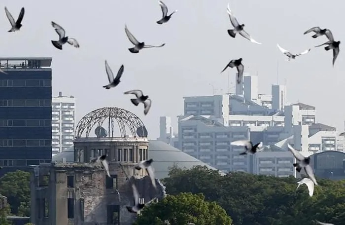 Chim bồ câu bay qua Công viên Tưởng niệm Hòa bình gần Vòm bom nguyên tử ở Hiroshima. (Nguồn: Reuters)