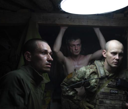 Các quân nhân Ukraine nói chuyện trong hầm trú ẩn ở chiến tuyến gần Kharkov, Ukraine ngày 2 tháng 7 năm 2022. Ảnh AP