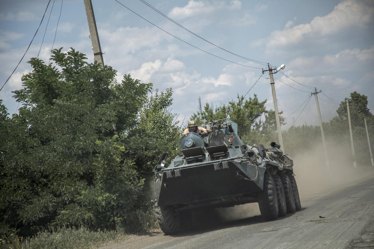 Binh sỹ Ukraine ngồi trên một chiếc xe bọc thép ở vùng Donetsk, Ukraine. Ảnh: Getty