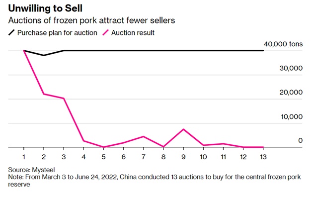 Nhưng kể cả khi thị trường thịt lợn phục hồi, có rất ít người bán tham gia vào các phiên đấu giá. Chính phủ Trung Quốc dự tính mua thêm 160.000 tấn thịt lợn trong tháng 6 nhưng chỉ có thể hoàn thành được một phần nhỏ kế hoạch đó.