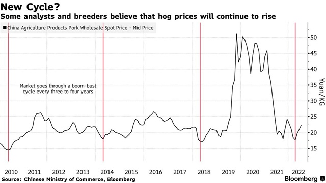 Mỗi chu kỳ tăng giá thịt lợn thường kéo dài từ 3-4 năm. Ảnh: Bloomberg.
