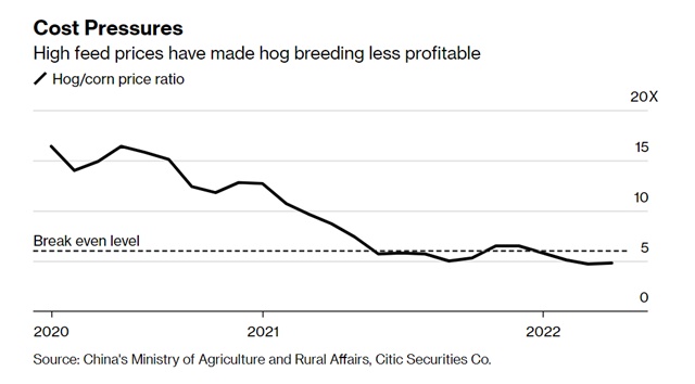 Tỷ lệ giá thịt lợn/giá ngô giảm xuống dưới ngưỡng ḥa vốn. Ảnh: Bloomberg.
