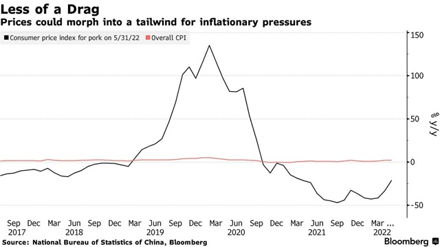 Trong tháng 5/2022, giá thịt lớn trong rổ hàng hóa CPI hiện vẫn thấp hơn so với một năm trước đó. Nếu không tính tới giá thịt lợn, CPI của Trung Quốc tăng tới 2,4% thay v́ 2,1% trên thực tế. Tuy nhiên, mọi chuyện có thể thay đổi khi giá thịt lợn liên tục tăng lên.
