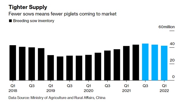 Đàn lợn nái tại Trung Quốc bắt đầu giảm từ cuối quư III/2021 cho tới cuối tháng 3 năm nay, và quá tŕnh phối giống, thai nghén, sinh sản và giết mổ kéo dài khoảng 10 tháng. Do đó, t́nh trạng thiếu hụt thịt lợn tươi đang dần trở nên rơ rệt. Đặc biệt là khi nền kinh tế Trung Quốc bắt đầu hồi phục sau khi các quy định pḥng dịch được nới lỏng.