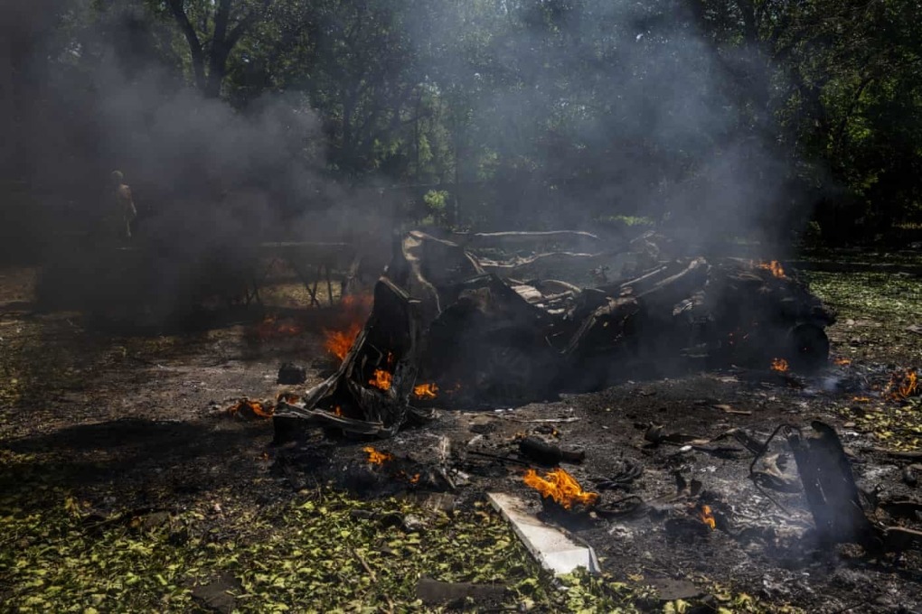 Tàn tích của một chiếc ôtô đang cháy do các cuộc tấn công ở thành phố Kramatorsk, tỉnh Donetsk, miền đông Ukraine ngày 7/7. Ảnh: AP.