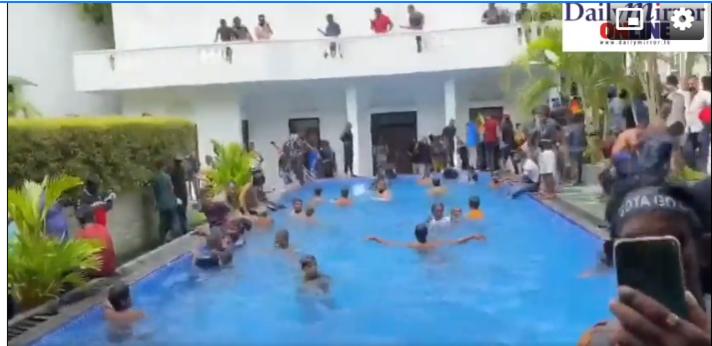 Cũng tại dinh thự của Tổng thống Gotabaya Rajapaksa, những người biểu tình tận hưởng sự mát mẻ khi bơi trong làn nước trong xanh của một hồ bơi ngoài trời. Những người khác chen chúc quanh mép hồ. Cùng lúc đó, nhiều người thực hiện những bài tập trong phòng tập thể dục của dinh thự.