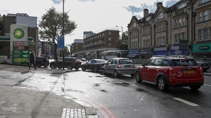 Các phương tiện xếp hàng chờ đổ xăng tại một trạm xăng ở London, Anh. (Ảnh: THX/TTXVN)