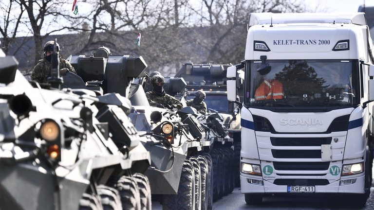 Các xe bọc thép của Hungary được triển khai sát biên giới Hungary - Ukraine, ở Vasarosnameny, ngày 25 tháng 2 năm 2022. Ảnh: AP