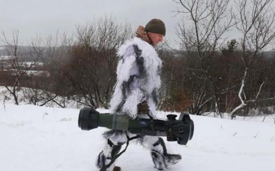 Một binh sĩ Ukraine mang theo tên lửa chống tăng mà Anh viện trợ trong cuộc tập trận gần Lviv, Ukraine hồi tháng 1 năm nay (Ảnh: AFP)