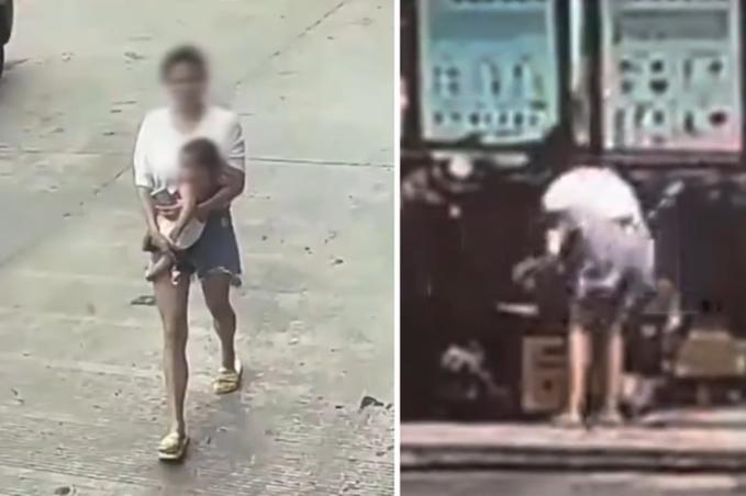 Khi đến nơi đổ rác, cô dừng lại và cúi xuống, đặt đứa bé vào trong vào trong một chiếc hộp carton, sau đó lấy điện thoại chụp ảnh và gửi cho chồng. Người mẹ sau đó bỏ mặc con giữa thời tiết nắng nóng, đi đến một cửa hàng gần đó để quan sát.
