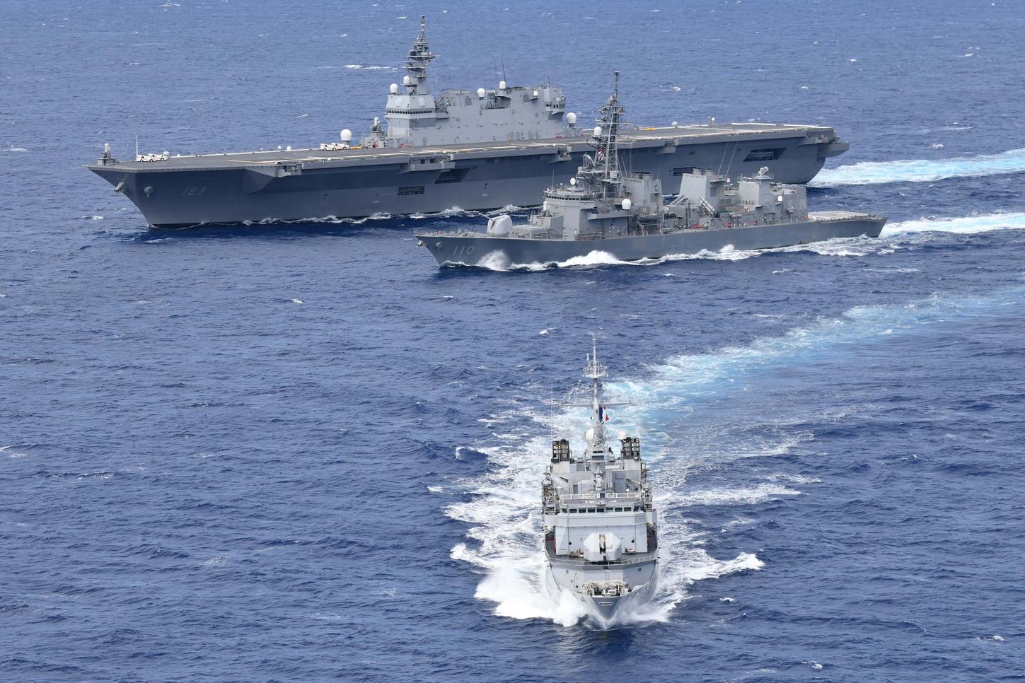 Tàu sân bay trực thăng Izumo (DDH-183) và khu trục hạm Takanami (DD-110) của Nhật Bản diễn tập trên biển với khinh hạm Prairial (F-731) của Pháp - Ảnh: BỘ QUỐC PHÒNG PHÁP