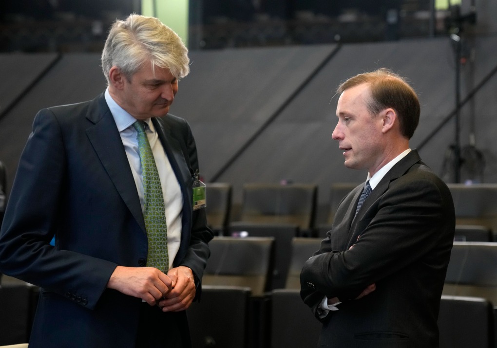 Cố vấn an ninh quốc gia Anh Stephen Lovegrove (trái) gặp người đồng cấp Mỹ Jake Sullivan tại trụ sở NATO, Brussels, Bỉ, tháng 10/2021. Ảnh: AFP.