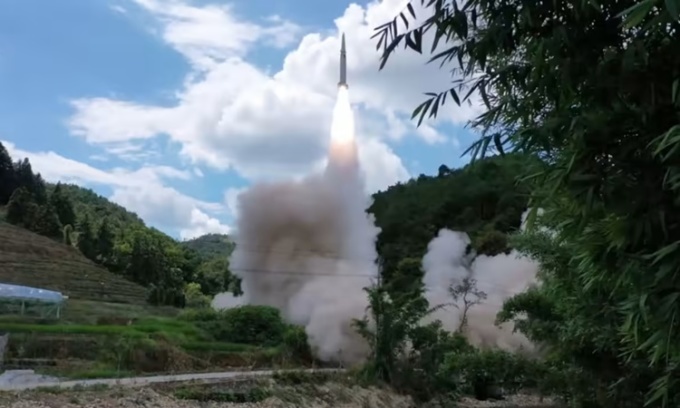 Bức ảnh do quân đội Trung Quốc công bố cho thấy tên lửa đạn đạo được khai hỏa trong cuộc tập trận ngày 4/8. Ảnh: Bộ tư lệnh Chiến khu miền Đông quân đội Trung Quốc.