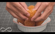 Phần nhân đậu xanh ngọt của bánh được bọc bằng vỏ gạo nếp, lăn vừng và chiên trong chảo ngập dầu cho đến khi có màu vàng bắt mắt và vỏ giòn.