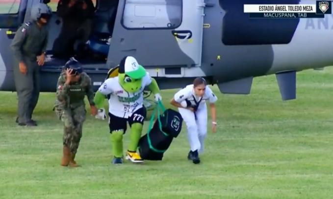 Người đóng vai linh vật được sĩ quan hộ tống từ trực thăng quân sự Mexico xuống sân vận động ở bang Tabasco hôm 11/8. Ảnh: Twitter/Olmecas Tabasco.