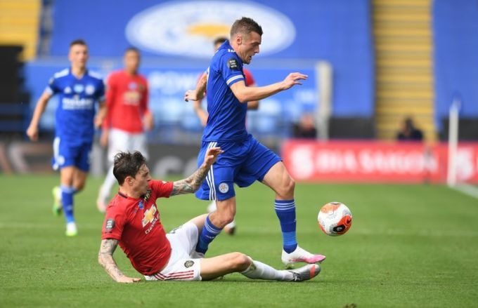 Vardy (xanh) đi bóng trong trận đấu giữa Leicester và Man Utd ở Ngoại hạng Anh năm 2020 trên sân King Power. Ảnh: Reuters