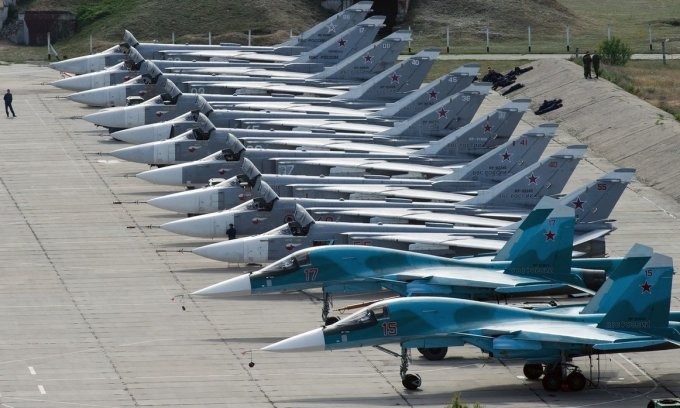 Cường kích Su-24 và tiêm kích bom Su-34 Nga tập kết tại sân bay Belbek hồi năm 2016. Ảnh: RT.
