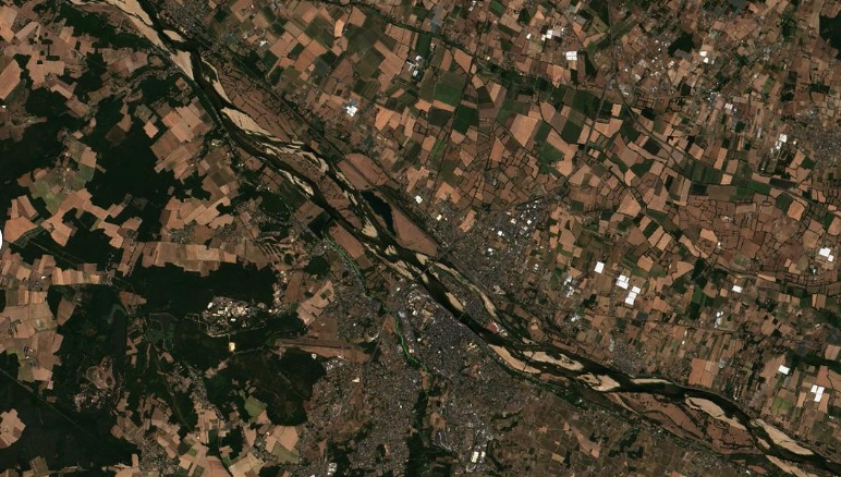 Sông Po nhìn từ ảnh vệ tinh. Khu vực cạn nước lộ rõ. Ảnh: CNN