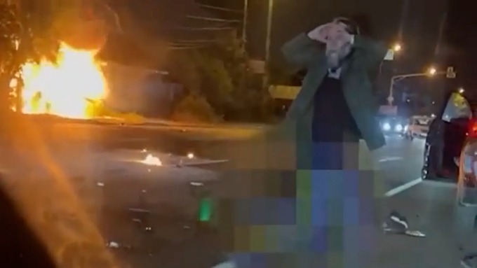 Ông Dugin đứng ôm đầu tại hiện trường vụ nổ xe khiến con gái thiệt mạng. Ảnh: Moscow Times.
