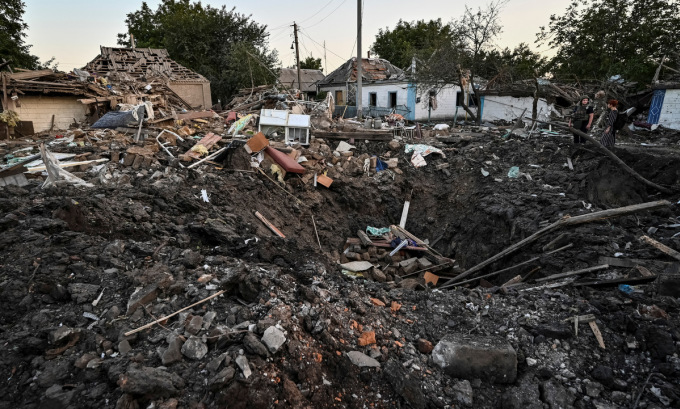 Hiện trường sau vụ tập kích thị trấn Chaplyne ở tỉnh miền trung Dnipro của Ukraine hôm 25/8. Ảnh: Reuters.