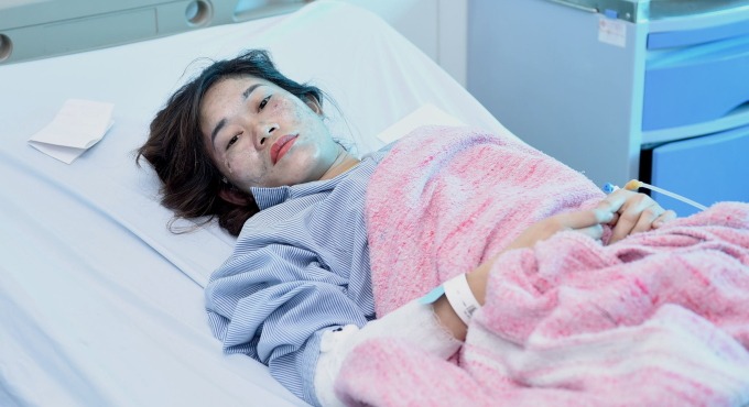 Công nhân Lương Thị Hiền bị bỏng cấp độ 3, đang được điều trị tại bệnh viện chiều 30/8. Ảnh: Phạm Chiểu