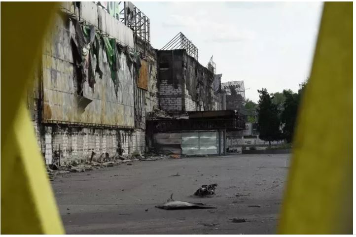 Quang cảnh trung tâm mua sắm Fabrika bị phá hủy ở Kherson vào ngày 20/7 khi Ukraine đang tìm cách giành lại Kherson. Một cố vấn của Tổng thống Ukraine Volodymyr Zelensky cho biết chiến lược của Ukraine là nhằm "nghiền nát một cách có hệ thống quân đội Putin". Ảnh Newsweek