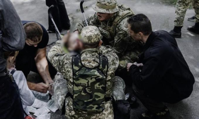 Dân quân tại hiện trường sơ cứu cho một nạn nhân. Ảnh: Telegram/BreakingMash.