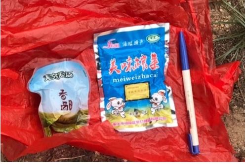 Số thực phẩm, bao gồm một quả trứng trà và một túi dưa muối kiểu Tứ Xuyên, được gói trong túi nylon. Đi kèm gói thực phẩm là một lá thư.