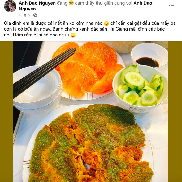 Theo đó Anh Đào chia sẻ trên trang cá nhân: "Gia đình em là được cái nết ăn không kém nhà nào, chỉ cần cái gật đầu của mấy ba con là có bữa ăn ngay. Bánh chưng xanh đặc sản Hà Giang mãi đỉnh các bác nhỉ!".