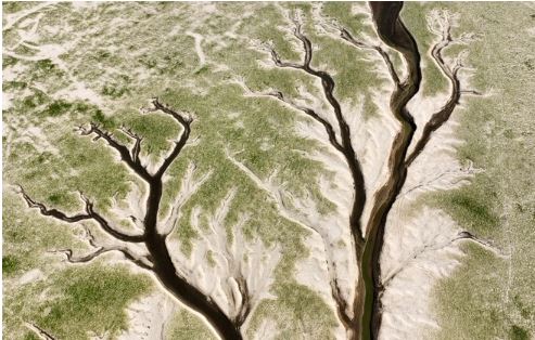 Nước tại hồ Bà Dương, tỉnh Giang Tây, Trung Quốc, thu hẹp để lộ ra các bãi bùn và nhánh nước giống hình cành cây. Ảnh: AFP.
