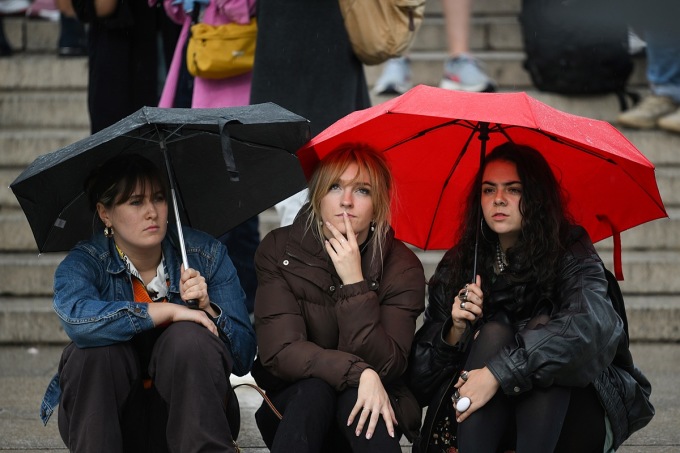Bất chấp cơn mưa lớn, hàng trăm người, trong đó nhiều người mang theo hoa, đang tập trung trước Cung điện Buckingham ở trung tâm thủ đô London để chờ tin tức và cầu mong điều tốt đẹp cho Nữ hoàng.