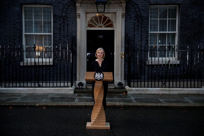 Thủ tướng Anh Liz Truss có bài phát biểu bên ngoài số 10 phố Downing. Ảnh: Reuters.