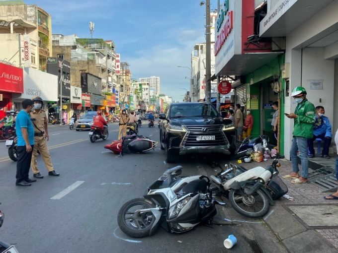 Xe Lexus 7 chỗ chạy gần đến ngã tư Phú Nhuận bất ngờ tông 5 xe máy, khiến ba người bị thương, chiều 10/9.