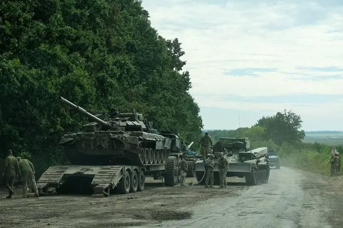 Các binh sĩ Ukraine đang chuẩn bị di dời một chiếc xe tăng Nga thu giữ được trong chiến dịch phản kích ở Kharkiv. Ảnh: Reuters