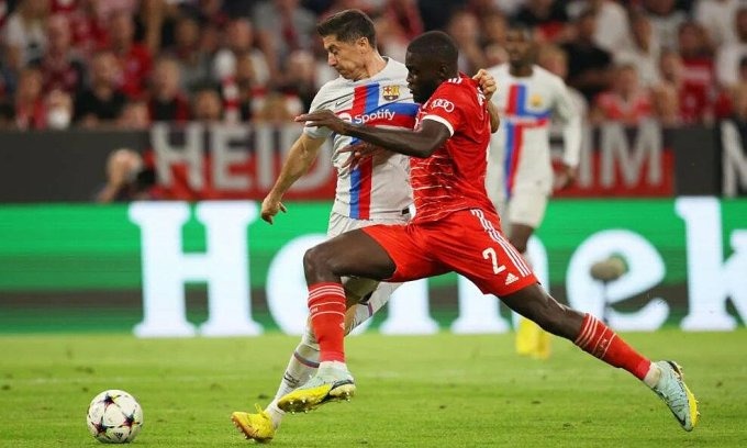 Lewandowski (trái) bị Upamecano kèm sát nhưng vẫn có nhiều cơ hội ở trận đấu lượt hai Champions League 2022-2023, trên sân Allianz Arena tối 13/9. Ảnh: UEFA