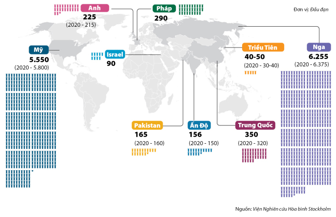 Số lượng vũ khí hạt nhân của các nước trên thế giới. Đồ họa: AFP.