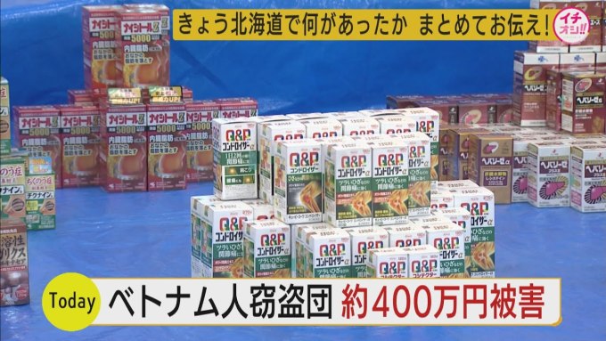 Lô dược phẩm, thực phẩm chức năng, tang vật bị nhóm ba người Việt đánh cắp ở Hokkaido, ngày 21/6. Ảnh chụp màn hình HTB News.