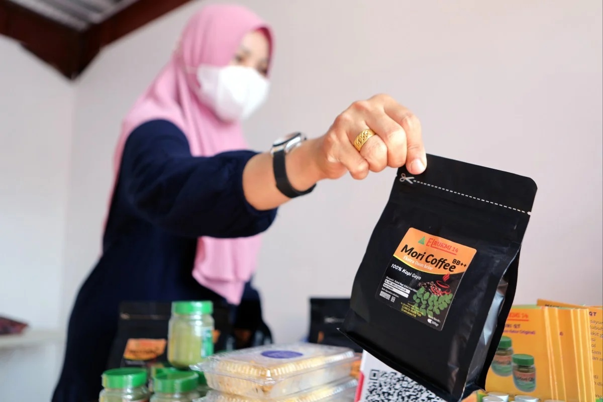 Doanh nhân Indonesia quảng cáo sản phẩm tại một sự kiện ở Banda Aceh. Ảnh: EPA-EFE