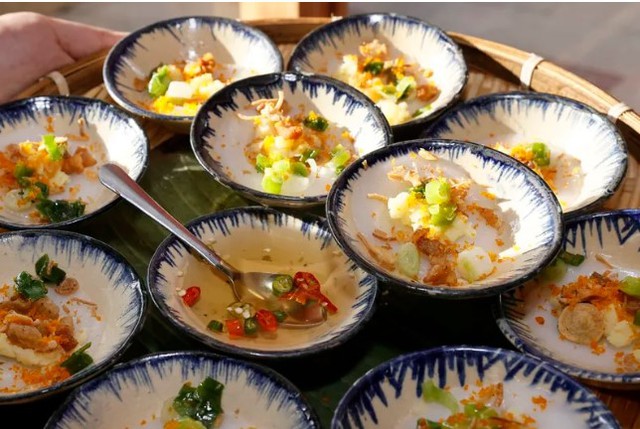 Nhà hàng phục vụ một khay tre 10 đĩa bánh bèo, một loại bánh gạo kiểu miền Trung Việt Nam tinh tế được hấp chín thành từng chiếc bánh nhỏ hình tròn xinh xắn trong từng chiếc đĩa nhỏ, sau đó là rắc ruốc tôm và bì lợn chiên giòn lên trên, rồi rưới nước chấm lên.