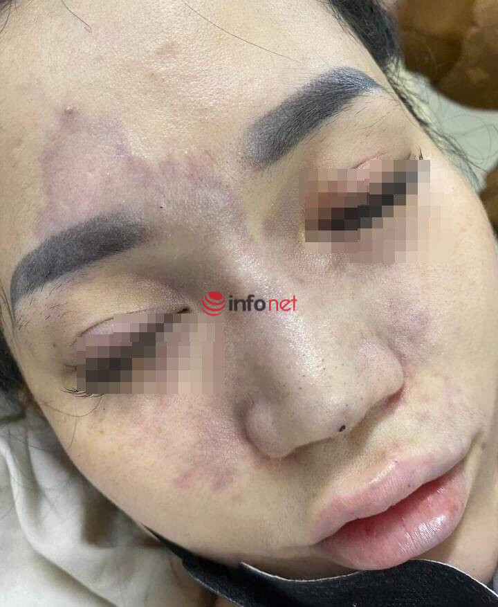 Tại đây chị được một nhân viên tên Tr. tiêm. Chỉ 5 phút sau tiêm, chị V bị sụp mí mắt, bầm tím lan rộng, đau nhức, không mở được mắt.Chị V đau đớn khóc thì được nhân viên Tr. nói không sao đâu, chỉ cần nằm hít thở là được. Liên hệ với chị Quỳnh là chủ tiệm spa, chị này cũng bảo chị V “nằm hít thở, thả lỏng thoải mái ra”.