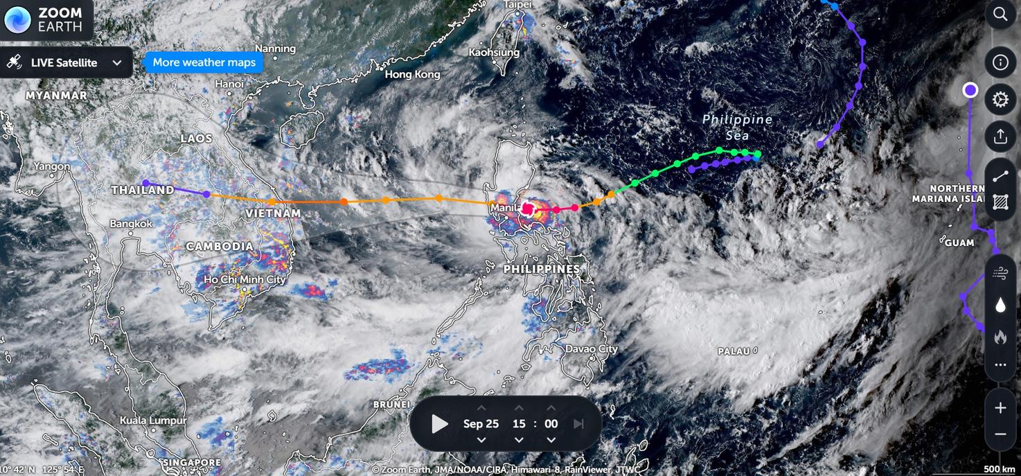 Vị trí siêu bão Noru trên bản đồ vệ tinh vào lúc 15 giờ chiều ngày 25/9 (ảnh: Zoom Earth)