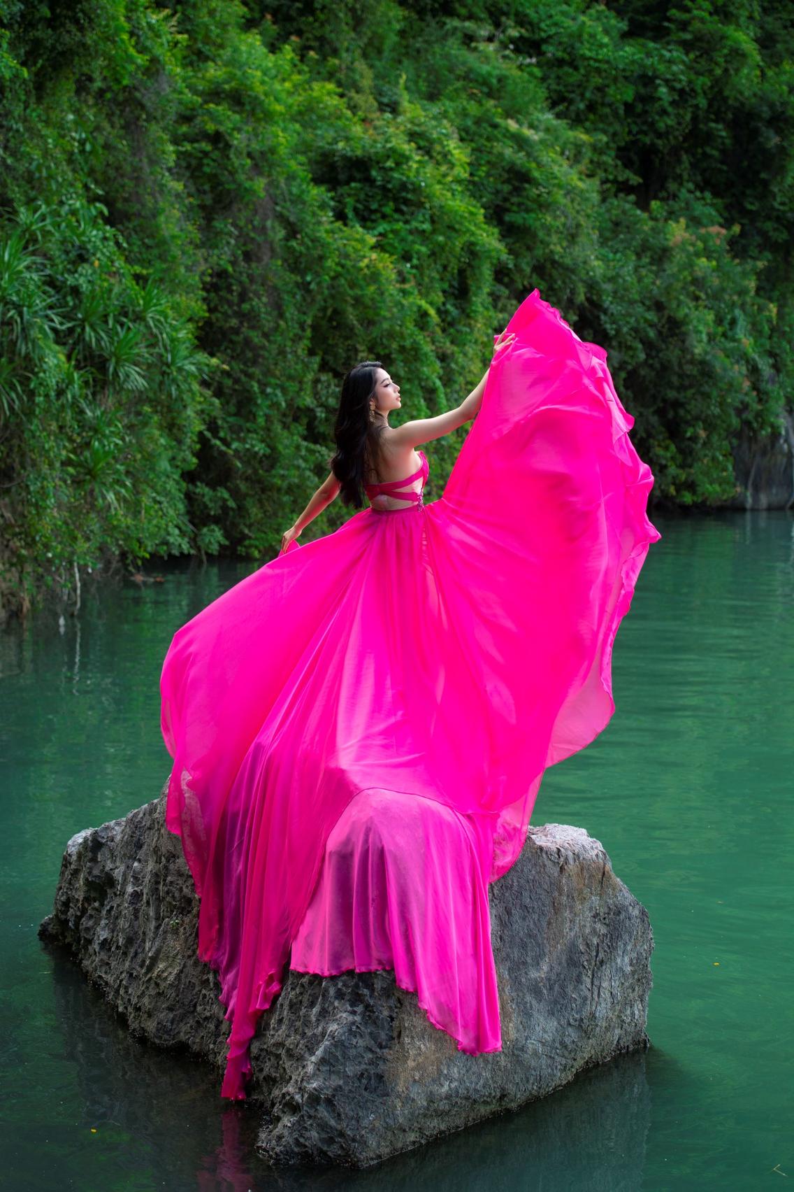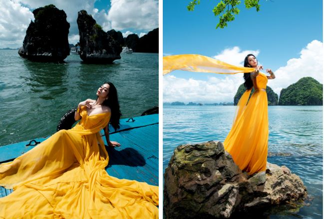 Trong bộ ảnh quảng bá vẻ đẹp Vịnh Hạ Long, Lâm Thu Hồng diện những thiết kế dạ hội sắc màu rực rỡ, chất liệu mềm mại bay bổng, vô cùng thu hút. Mỗi bức hình của Lâm Thu Hồng đều đẹp như tranh, khoe trọn vẻ đẹp của những kỳ quan đảo đá vôi vách đứng, bầu trời lồng lộng và mặt biển bình yên.