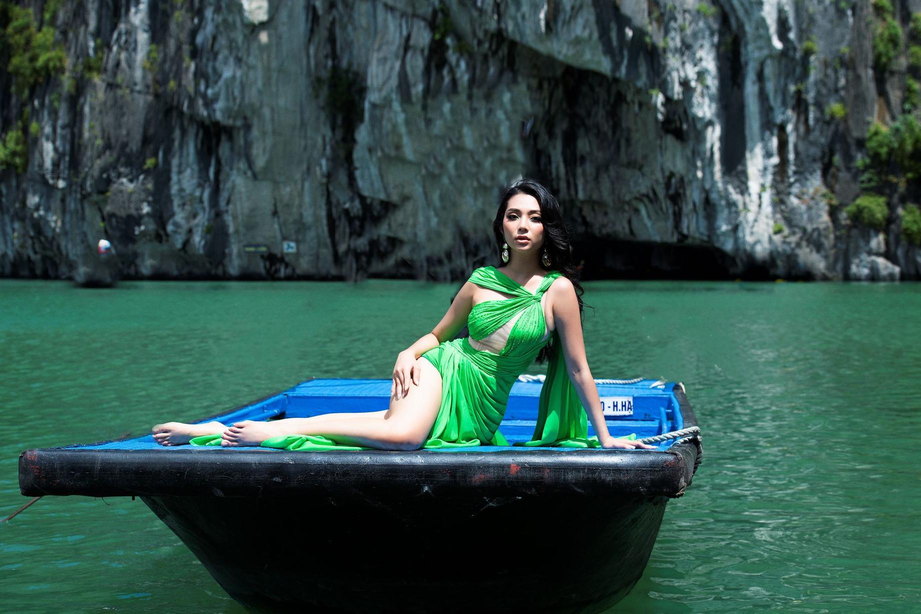 Sự tương phản giữa sắc màu dạ hội và sự trầm tĩnh hiền hoà của kỳ quan tạo nên một ấn tượng thị giác mạnh mẽ mà hoà quyện giữa con người, kỳ quan và bầu trời. Lâm Thu Hồng tin tưởng, chắc chắn bạn bè quốc tế sẽ ấn tượng với một Vịnh Hạ Long mà cô giới thiệu đến The Miss Globe 2022.