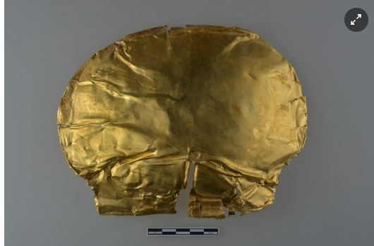 Mặt nạ vàng từ thời nhà Thương được khai quật tại thành phố Trịnh Châu, tình Hà Nam. Ảnh: CGTN.